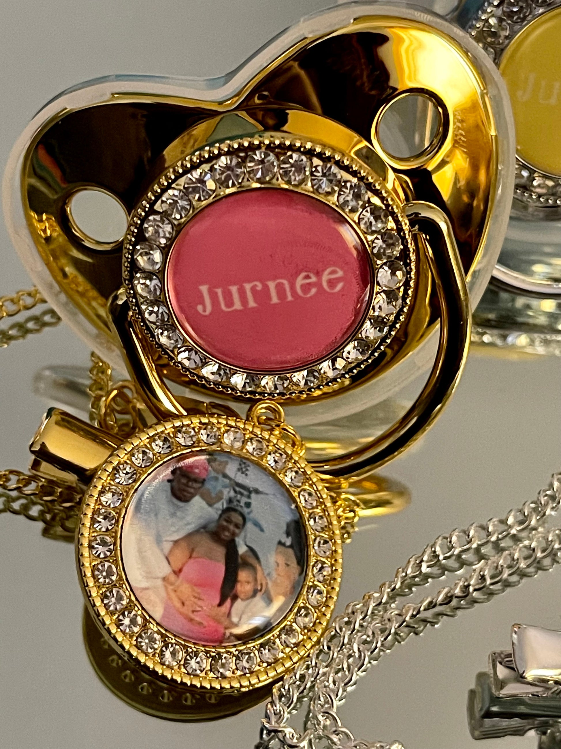 Order a personalized pacifier. Available in 3 different colors. You can choose one photo and your baby’s name or you can choose two photos per pacifier.